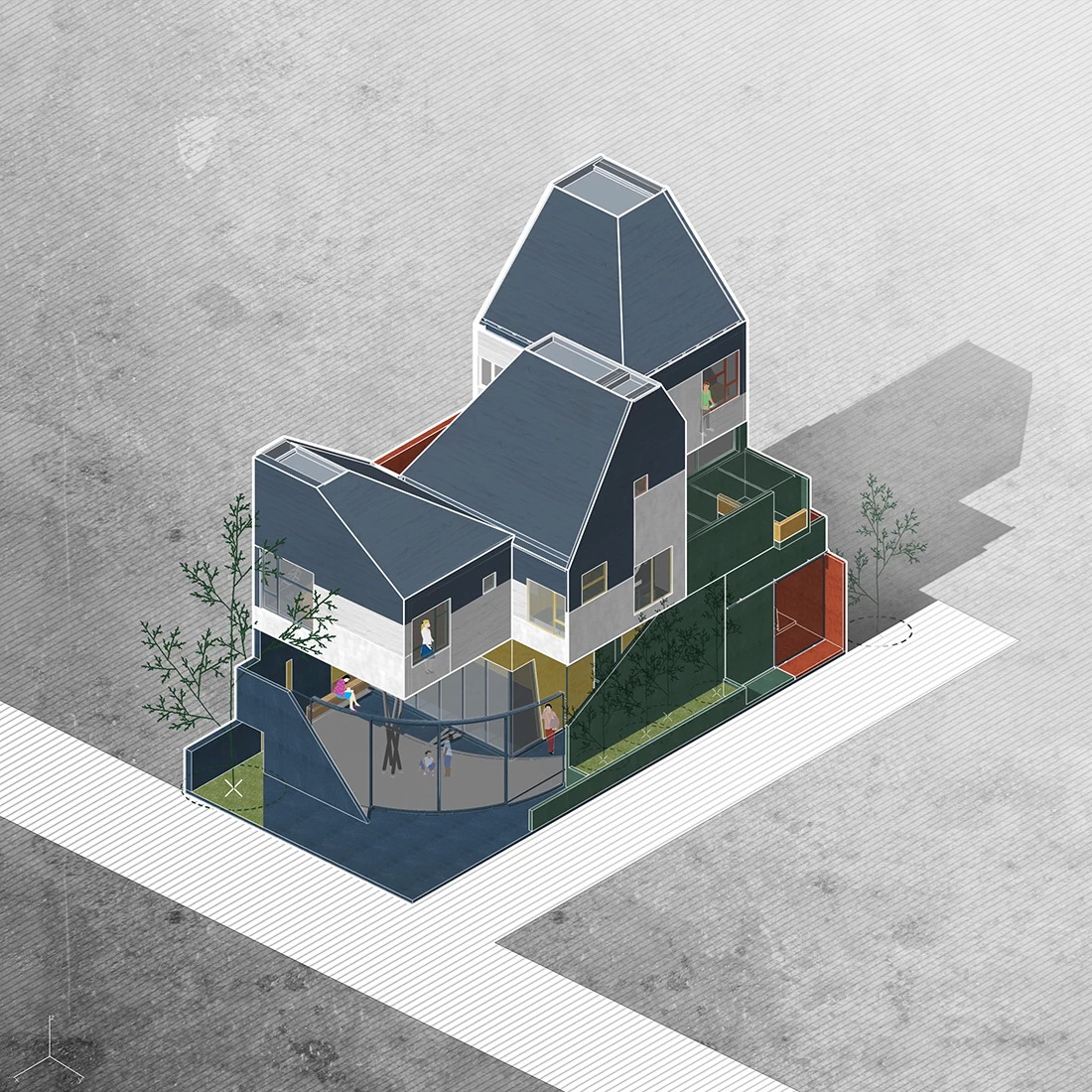 Inspired by the renowned animation movie "Laputa – Castle in the Sky" by Studio Ghibli - we want to create “a floating school” and leave the below area for soft activities such as playing area, office, medical room... Taking the advantage of two frontages, the floating blocks were studied to be able to maximize the intensity of interior light for the learning spaces. From a distance, the whole architecture looks interestingly like a giant colorful toy among residential clusters.