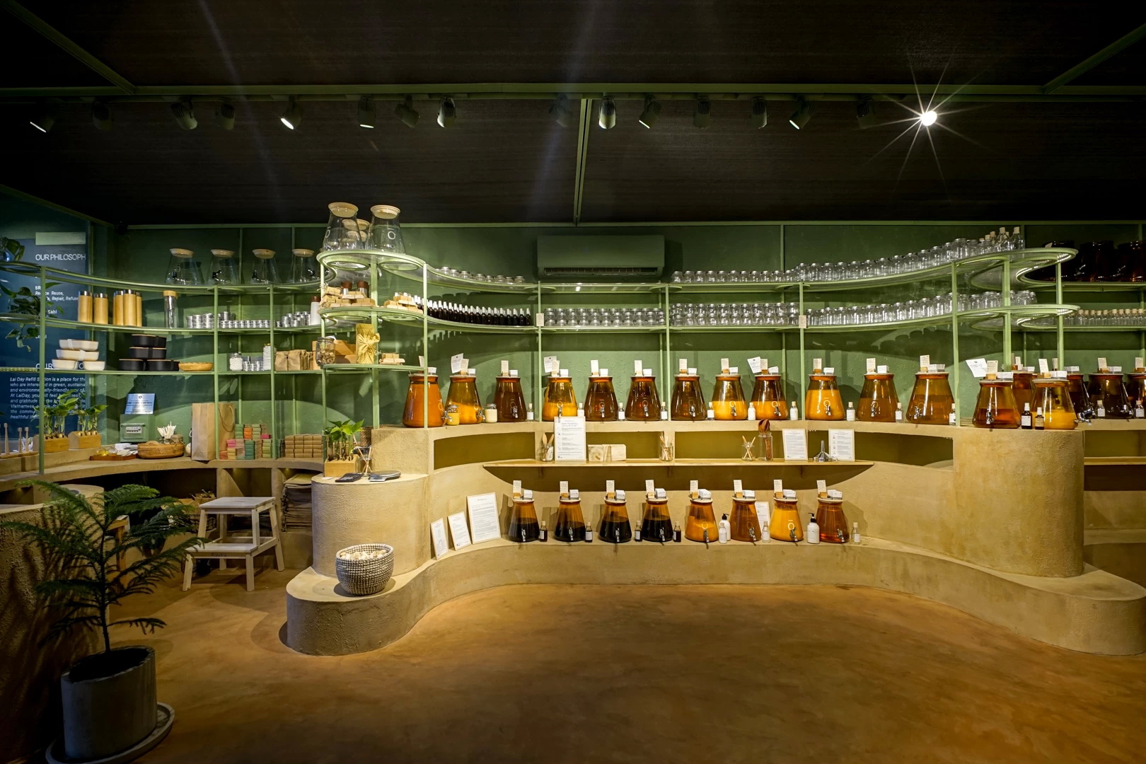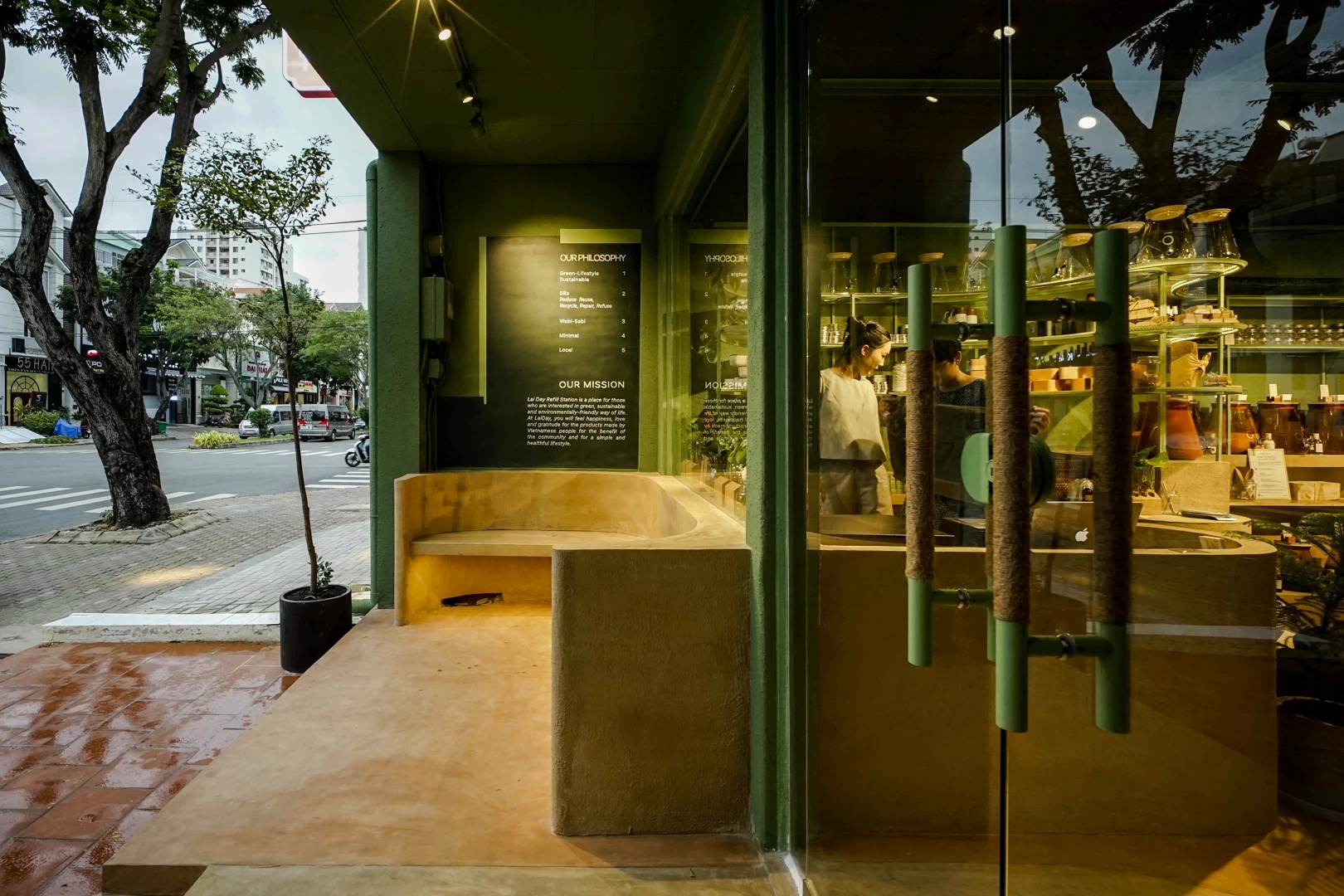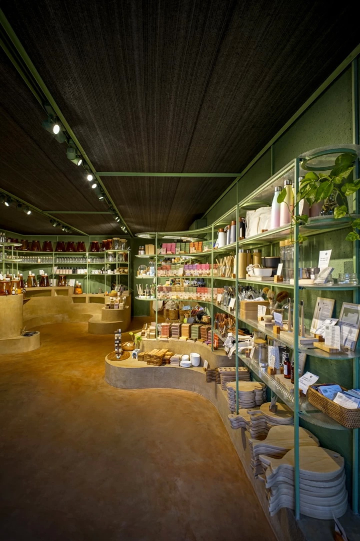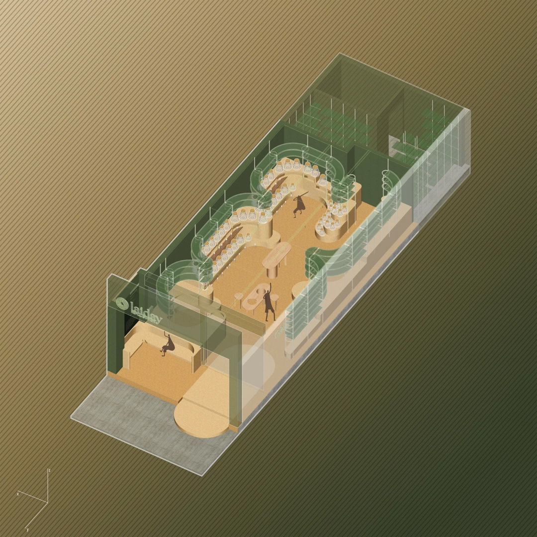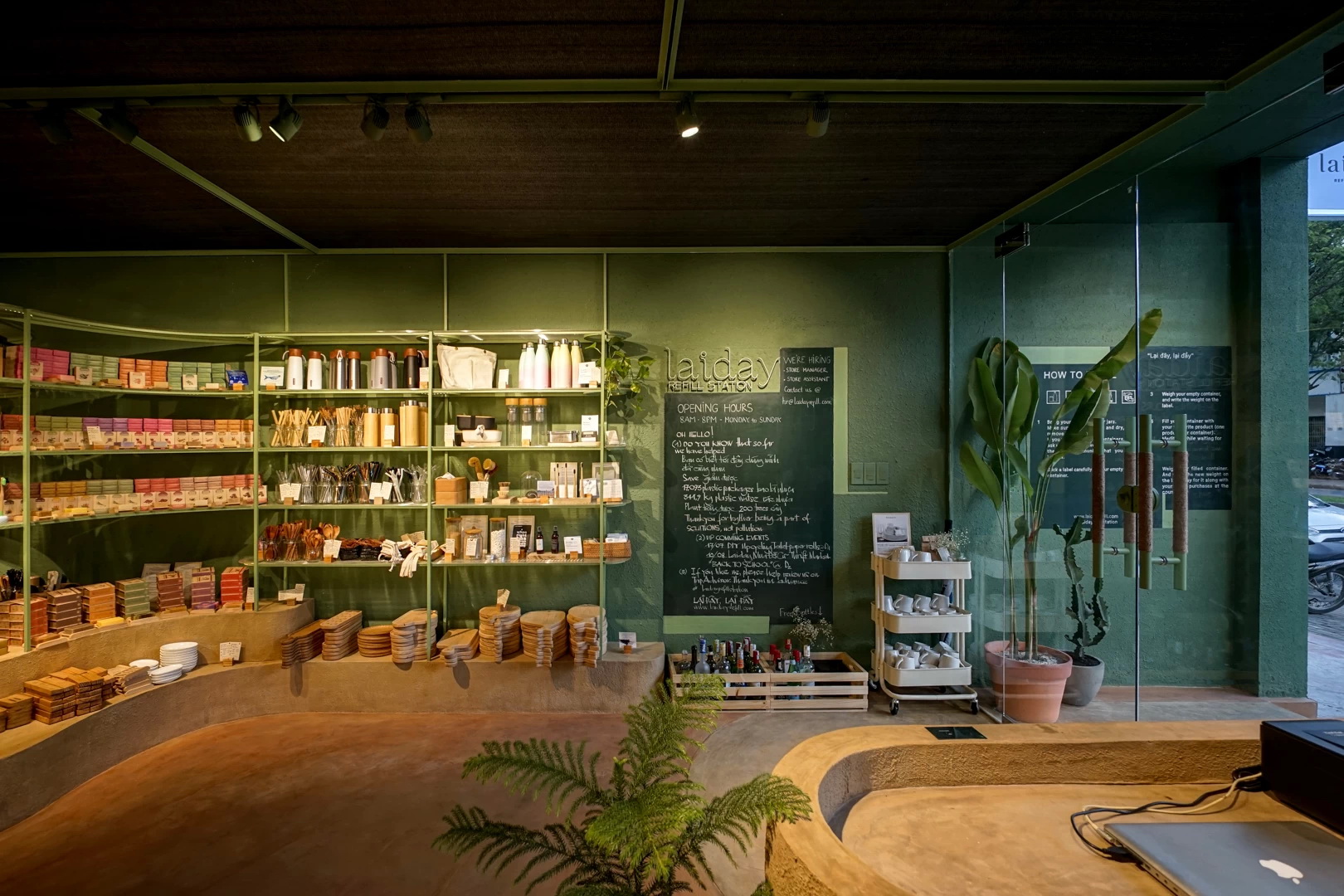 After nearly a year of growing the first Laiday Refill Station in Thao Dien, District 2, we have the opportunity to design the second one launching just right in Phu My Hung, District 7 with around 60sqm floor area. The design quest this time is how to meet the space utilization requirements in this new plot, but still, ensure to retain the distinctive characteristics of the philosophy that Laiday has been pursuing. The context is a prefabricated space which is constructed by an existing 24ft-container extended with steel frame structure. Inspired by the image of terraced fields, the design proposal is featuring a continuous long shelf which begins from the lobby to the waiting bench, cashier area, refill booth, and then back to the starting point. Although the meandering of the display shelf helps to divide the space into separating “pockets of activities”, it still preserves space connection as a whole generally. The in-out relationship, along with the continuity of displaying space, could provide seamless experience for each visitor when stopping by here./.